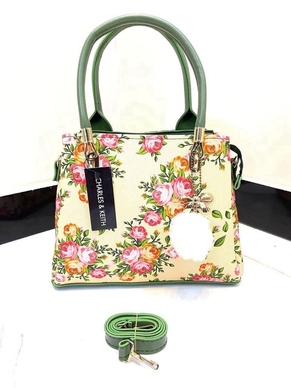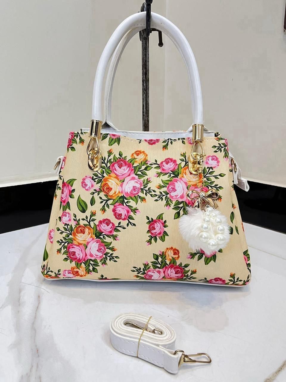 Elegant Floral Pattern Handbag with Stylish Handle and Charm Accent